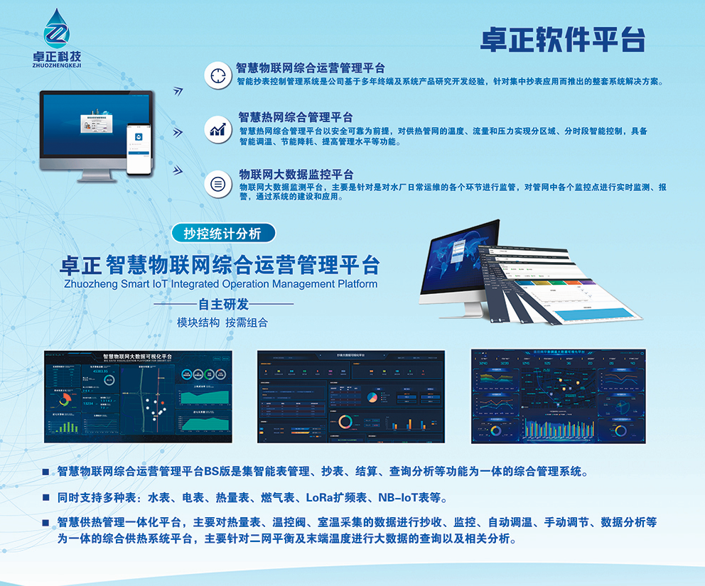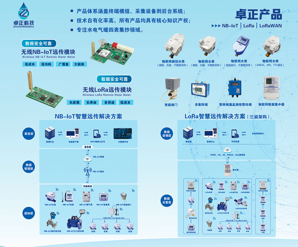 河南卓正電子科技有限公司,專業(yè)的物聯(lián)網(wǎng)表應用方案提供商,擁有一支多名博士、碩士組成的核心研發(fā)團隊,率先將NB-IoT、LoRa遠傳技術、智能閥控技術應用于水務、熱力、燃氣、農(nóng)業(yè)、消防、環(huán)境領域,以“領航智能儀表 構建智慧城市”為企業(yè)使命,立志成為中國智能儀表行業(yè)領域中的領跑者,為推動中國能源計量事業(yè)的發(fā)展貢獻自己的力量!