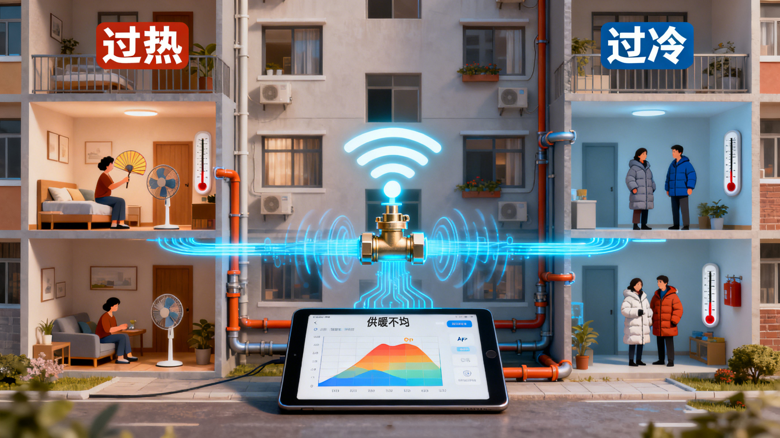 想象一下,我們的供暖管道如同人體的血液循環(huán)系統(tǒng)。熱水就是血液,需要被均勻地輸送到每個(gè)房間(末端,如暖氣片或地暖盤管)。水利失衡就是指,由于管道長度、阻力不同等原因,導(dǎo)致離熱源(鍋爐或換熱站)近的“近端”循環(huán)過快,水流過大,房間過熱;而離熱源遠(yuǎn)的“遠(yuǎn)端”循環(huán)不暢,水流過小,房間冰冷。這不僅造成了用戶體驗(yàn)差,更導(dǎo)致了大量的能源浪費(fèi)。